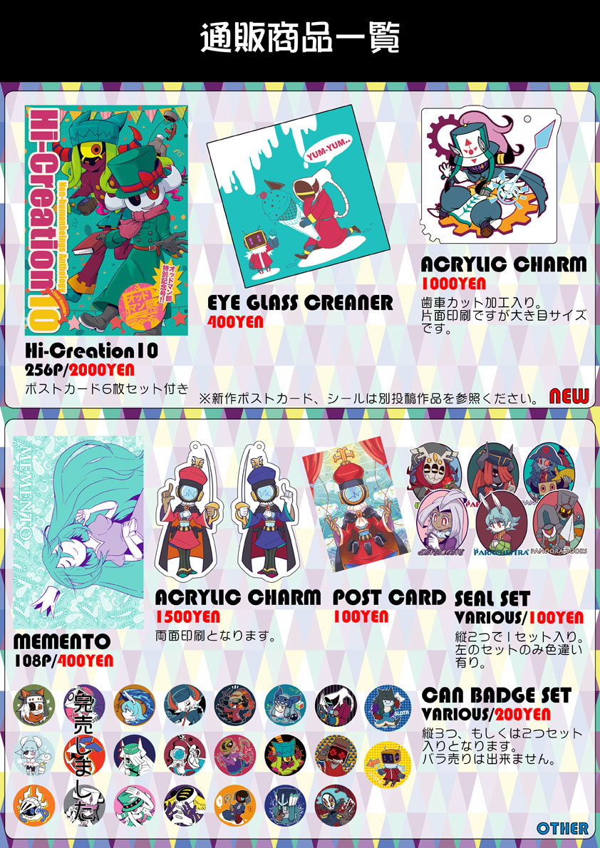 2015/05/21 Category : ドウジン・キカク 期間限定通販受付のお知らせ comitia112及びデザインフェスタで販売しました商品を期間限定で通販をしたいと思います。通販受付期間:7/1まで品物によっては数が数点のみとなっているもの、こちらでは販売せずにアートスープ様への委託にまわしているものもございます。以下の詳細をお読みになってからお申込みください。 現在受付できますものは上記3つの画像のもののみとなります。1枚目の画像の商品の価格は赤文字で書かれております。2枚目の新規ポストカードは左上の番号がその下のポストカードの番号です。3枚目のシールはキャラクターの下に書いてある番号と名前が対応しているものとなります。SQUAREx2の関連品は私が在庫を持っていないため、そちらは販売できませんのでご了承ください。パラケス缶バッジセットは1種類完売しております。バトランゼの王様のセット(左から4つめのセット品)は手持ち在庫残り1セットとなっております。オズマのポストカード(画像一枚目のほう)も残り1枚となります。MEMENTOは残り3冊です、委託のほうはすでに販売終了となっております。・アクリルチャームの指定は価格が1500円のほうや、キャラクターの名前指定で・シールセットと缶バッジは「左から××番目のセット」や、名前指定で・別画像のポストカード各種とシールセット(組み合わせ自由)のほうは番号でそれぞれお知らせください。「ストテラさんがいる缶バッジのセットで!」といった感じで名前指定していただければ大丈夫です。どう注文すればいいか分からない場合はお気軽にお問合せください。------------------------------------------------------------注文方法:メール【n_tousei@mail.goo.ne.jp】に・欲しいグッズ名前と個数(番号があるものは番号指定や名前指定で)・送り先の住所・お名前・希望する振込先・名刺同封の有無と欲しい枚数(現在銀刷り名刺、デザフェス用のカラー名刺の2種類がございます、片方のみ、両方指定可能です)を記載して送ってください。折り返し詳細メールを送らせていただきます。お支払方法:銀行振り込み、ゆうちょ銀行のどちらか※入金にかかる手数料はご負担していただく形となります。郵送料:グッズのみや、本が1冊までの場合はレターパックライト(360円)、本が2冊以上の場合はレターパックプラス(510円)が品物代と別途かかります。上記2つの方法以外での発送は今回受付いたしません。------------------------------------------------------------通販で無くなったグッズは基本再販はございません。特に缶バッジは今回限りで再販はかけずに在庫を無くします。(今後の新作グッズの場所確保のため)ご注文、お待ちしております! PR Comment0 Comment Comment Form お名前name タイトルtitle メールアドレスmail address URLurl コメントcomment パスワードpassword