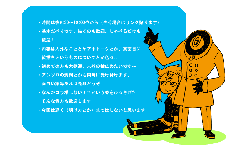 2009/07/18 Category : ゴホウコク とりあえず告知 18日夜(今日の夜)にでも、久々にエチャしようかなと思ってます。 といっても、本人は人外トークとか、アホ話がしたいだけなんで、そんな描かないと思います。 人外仲間みつけたい方は是非ご参加くださいませ。というより、自分がみつけたいだけです(ぉ 追記 なんということでしょう、サバ落ちではじきだされました(涙 すごく盛り上がっているときだったので、とてもショックですが、今日は混むわな... また開催予定ですので、宜しかったらご参加くださいませ。 次は夏コミ前、8月を予定しております