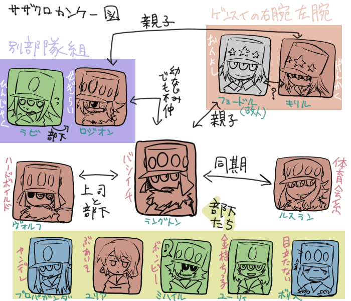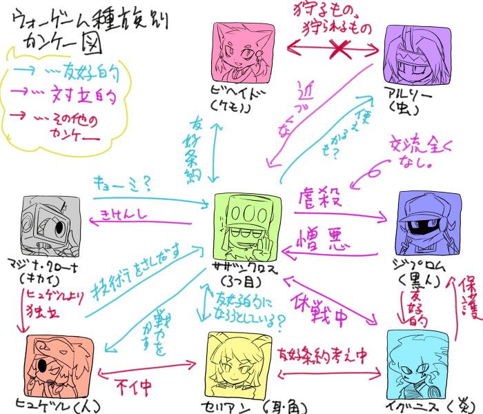 2009/07/23 Category : ソーサク お前の席ねーから! 左がサザンクロス関係の関係図、右が種族としての関係図。 どうも、おなかこわしまくりで寝れない冬生です。 また寝れない日々が続いてます。一番眠いのがお昼。しかしお昼ねたからってスッキリするわけでもなく... すぐに睡眠障害になる体、そして雨に弱い体。まさに今日はダブルパンチで午後はずっと横になっていました。 これは酷い。 最近は「自分で自分の脳制御しきれてないんじゃないか」って思うようになってきました。 だって考えたくもないのに考え始めるこの頭。無心になることすら考えないとできないとかどうなっているんだろうと思ってしまう。 ボケーっとすることをどんどん忘れてしまいそうな...傍から見ればいつもボケーっとしているんでしょうけど、 絶対何か考えてます。それがこちらが考えたくない悲劇的なこととか、難しいこととか。 考えることはいいけど、考えすぎて落ち着けない脳もどうかと思う。 体調不良自慢はほどほどに なんだか「見えない敵と戦っているたいぷの人」といわれれば、とても合っている気がしますぞ。 あ、携帯やっと買いました。番号もアドレスもそのままなので、 こちらのアドレス知っている方は送ってもらえるとありがたいです! いつか作ろうと思っていた関係図をやっと作ってみたり。殴り書きもいいところです。 まだちゃんと作れていない種族(特にビヘイド、マジナ・クローナ) とかもいれば、基盤ができていない部分もあってこれ一体どうやったら描けるのかなぁ...と頭をかかえてしまいます。 そしてちゃんと名前出たのとかが多分いるかも(ランパパとか) 国を治める元帥の右腕左腕は今一人かけている状態なので、結構大変だったり、片腕のキリルがちょっと暴走しはじめようとしている状態だったりと色々あるらしい。 そしてその空いた片腕には、実はラングトンに声がかかっているというが、本人は今は望んでいないらしいとか。 ロジオンとラングトンが幼馴染で父親がどちらもお偉いさんだけど、片方死んでいたり、あと母親がどっちも同じ種族だったり 同期に体育会系がいたりとか色々ありますが、 主人公があまりにも普通すぎる!というのが今回ですごく分かってしまったと実感。 種族間のは、キャラでたとえるとまた変わってきてしまいますが、基本的に三つ目嫌われすぎ。 とりあえず、アルソーはヒトとしてみられていない部分もあるので、扱いが酷いとか。 また少しずつ創作も出していけるようになりたいなー PR